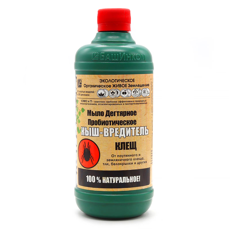 SĂPUN GUDRON PROBIOTIC KYSH-DĂUNĂTOR UNIVERSAL pentru prevenirea bolilor plantelor și combaterea eficientă a dăunătorilor pe terenurile de grădină. Avertizează, distruge și respinge o întreagă galaxie de dăunători: afide, acarieni, fluturi, gândaci și chiar rozătoare. Săpunul este un amestec lichid gros de culoare maro, ale cărui ingrediente principale sunt sărurile de potasiu ale acizilor grași, gudron de mesteacăn și bacterii naturale benefice - probiotice. Pentru producerea săpunului se folosesc numai ingrediente naturale. O soluție apoasă de săpun de gudron formează o peliculă protectoare pe suprafața plantei tratate. Mirosul de gudron este reținut de film și respinge dăunătorii pentru o lungă perioadă de timp. Pe corpul insectelor, pelicula blochează tractul respirator, ceea ce provoacă moartea acestora. Bacterii naturale benefice care ajută la restabilirea creșterii și la întărirea imunității plantelor.