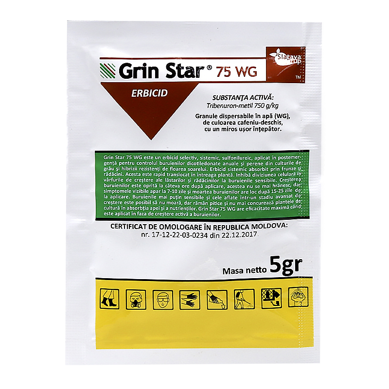 GRIN STAR 75 WG este un erbicid selectiv, sistemic, sulfonilureic, aplicat in postemer genta pentru controlul buruienilor dicotiledonate anuale si perene din culturile de grau si hibrizii rezistenti de floarea soarelui. Erbicid sistemic absorbit prin frunze si radacini. Aceasta este rapid translocat in intreaga planta. Inhiba diviziunea celulara in varfurile de crestere ale lastarilor si radacinilor la burienile sensibile. Cresterea buruienilor este oprita la cateva ore dupa aplicare, acestea nu se mai hranesc, dar simptomele vizibile apar la 7-10 zile si moartea buruienilor are loc dupa 15-25 zile de la aplicare. Buruienile mai putin sensibile si cele aflate intr-un stadiu avansat de crestere este posibil sa nu moara, dar raman pitice si nu mai concureaza plantele de cultura in absorbtia apei si a nutrientilor. Grin Star 75 WG are eficacitate maxima cand este aplicat in faza de crestere activa a buruienilor.