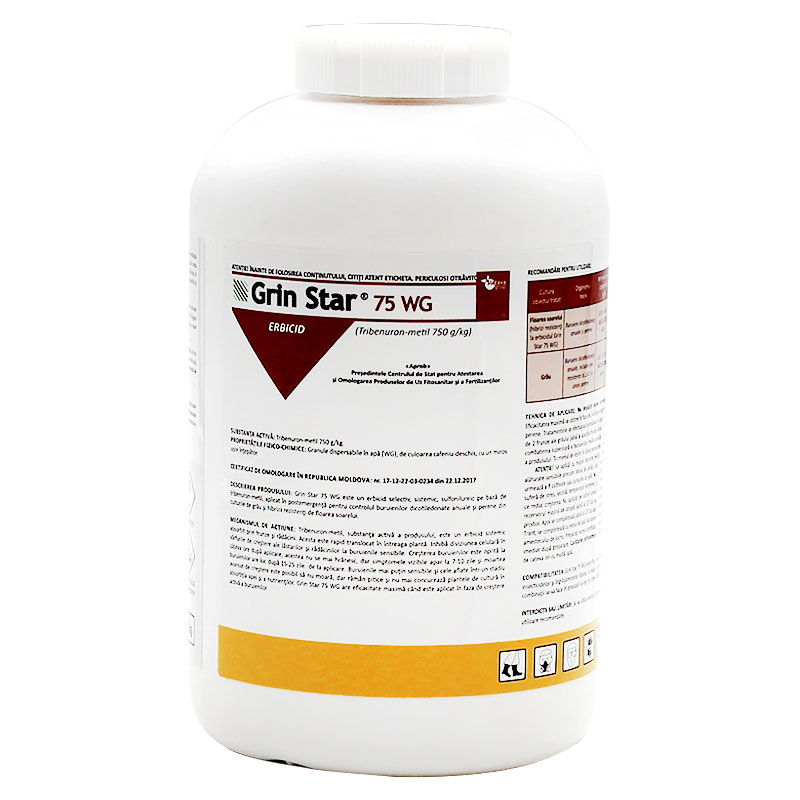 GRIN STAR 75 WG este un erbicid selectiv, sistemic, sulfonilureic, aplicat in postemer genta pentru controlul buruienilor dicotiledonate anuale si perene din culturile de grau si hibrizii rezistenti de floarea soarelui. Erbicid sistemic absorbit prin frunze si radacini. Aceasta este rapid translocat in intreaga planta. Inhiba diviziunea celulara in varfurile de crestere ale lastarilor si radacinilor la burienile sensibile. Cresterea buruienilor este oprita la cateva ore dupa aplicare, acestea nu se mai hranesc, dar simptomele vizibile apar la 7-10 zile si moartea buruienilor are loc dupa 15-25 zile de la aplicare. Buruienile mai putin sensibile si cele aflate intr-un stadiu avansat de crestere este posibil sa nu moara, dar raman pitice si nu mai concureaza plantele de cultura in absorbtia apei si a nutrientilor. Grin Star 75 WG are eficacitate maxima cand este aplicat in faza de crestere activa a buruienilor.