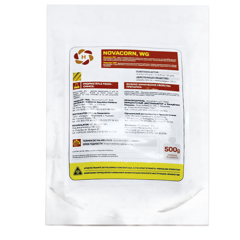 PROPRIETĂTILE FIZICO-CHIMICE: NOVACORN, WG - granule dispersabile in apă de culoare galben-brună, cu miros chimic uşor pronunţat, nu este inflamabil şi nu are proprietăți corozive.