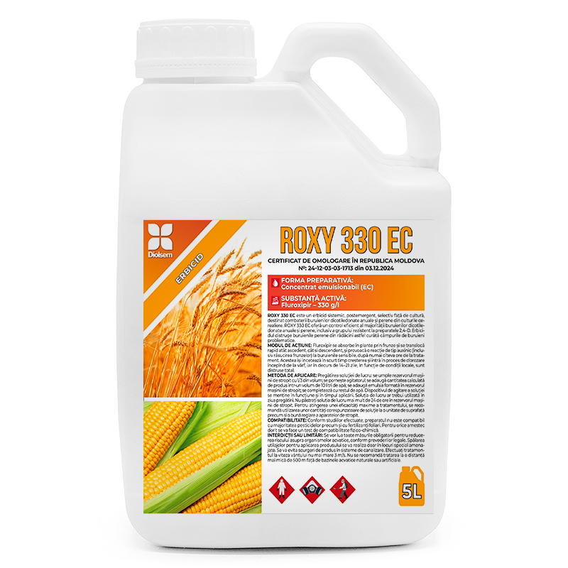 Roxy 330 EC este un erbicid auxinic sintetic, postemergent și selectiv, destinat combaterii buruienilor dicotiledonate anuale și perene din culturile de grâu și porumb. ROXY 330 EC oferă un control eficient al majorității buruienilor dicotiledonate anuale și perene, inclusiv a grupului rezistent la preparatele 2,4-D. Temperatura optimă de aplicare a erbicidului este între 8-25°C. În aceste condiții, plantele au o dezvoltare normală, iar substanța activă este absorbită de frunze, după care este translocată în punctele de creștere ale buruienilor. Este supus degradării biologice rapide în sol și nu prezintă riscuri de fitotoxicitate asupra culturilor din asolament.