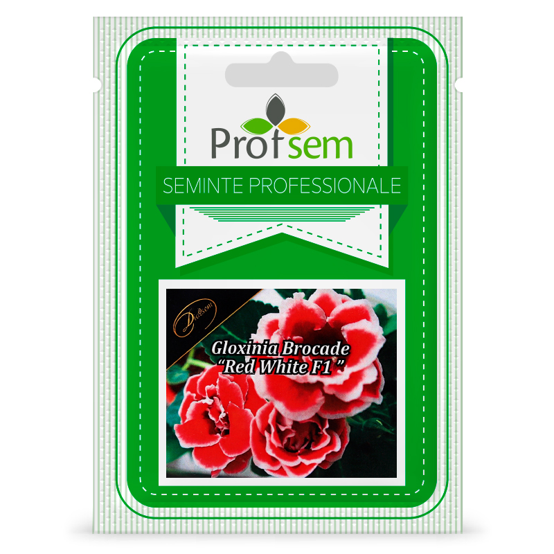 Gloxinia Brocade "Red White F1" - plantă tuberoasă de interior din familia Gesnerievie. Magnifice flori duble, roșii, cu margine albă, înfloresc una după alta. O plantă compactă cu creștere scăzută, cu frunze mici. Pe o plantă adultă se formează 10-25 de flori mari. Gloxinia preferă locurile luminoase, însorite, fără expunere la lumina directă a soarelui.