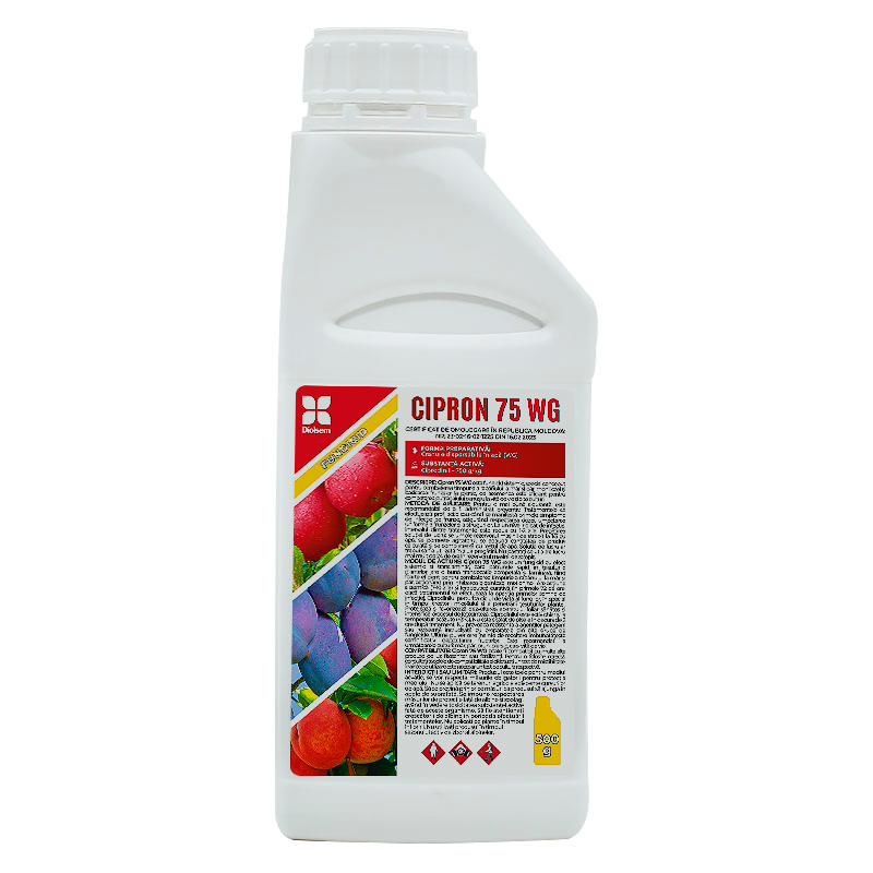 Cipron 75 WG este fungicid sistemic, special conceput pentru combaterea timpurie a rapǎnului la măr şi păr, moniliozei şi băşicarea frun- zelor la piersic, de asemenea este efici- ent pentru combaterea putregaiului cenuşiu la vita de vie şi alte culturi.