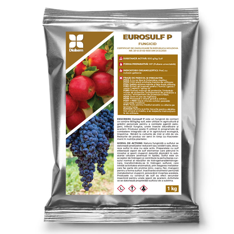 Eurosulf P este un fungicid de contact ce conține 800g/kg sulf, este utilizat în agricultură și grădini personale pentru a combate agenții patogeni, infecții fungice, unele insecte dăunătoare și acarieni. Produsul poate fi utilizat în programele de combatere integrată cât și în agriclutura ecologică, împotriva făinării la culturile de măr și viță de vie. Resturile de produs vor servi în timp ca macroelement în nutriția plantelor.