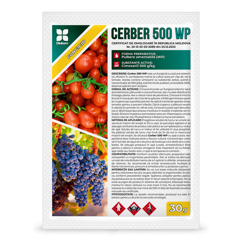 CERBER 500 WP este un fungicid sistemic local (translaminar), destinat combaterii manei la vița de vie și tomate.