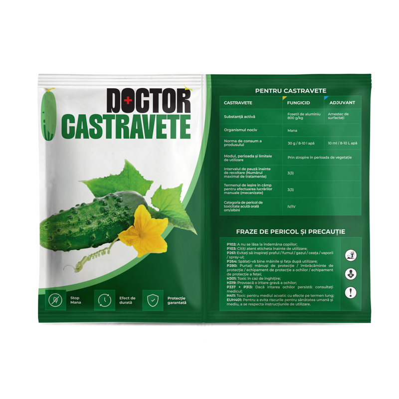 Doctor Castravete este o combinație eficientă dintre un fungicid sistemic pe bază de fosetil de aluminiu și un adjuvant special, concepută pentru protecția completă a castraveților împotriva bolilor fungice. Produsul oferă acțiune preventivă și curativă, stimulând în același timp mecanismele naturale de apărare ale plantelor.