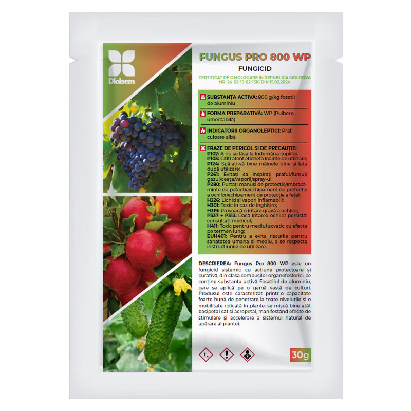 Fungus Pro 800 WP este este un fungicid sistemic cu acțiune protectoare și curativă, din clasa compușilor organofosforici, ce conține substanța activă Fosetilul de aluminiu, care se aplică pe o gamă vastă de culturi. Produsul este caracterizat printr-o capacitate foarte bună de penetrare la toate nivelurile și o mobilitate ridicată în plante: se mișcă bine atât basipetal cât și acropetal, manifestând efecte de stimulare și accelerare a sistemul natural de apărare al plantei.
