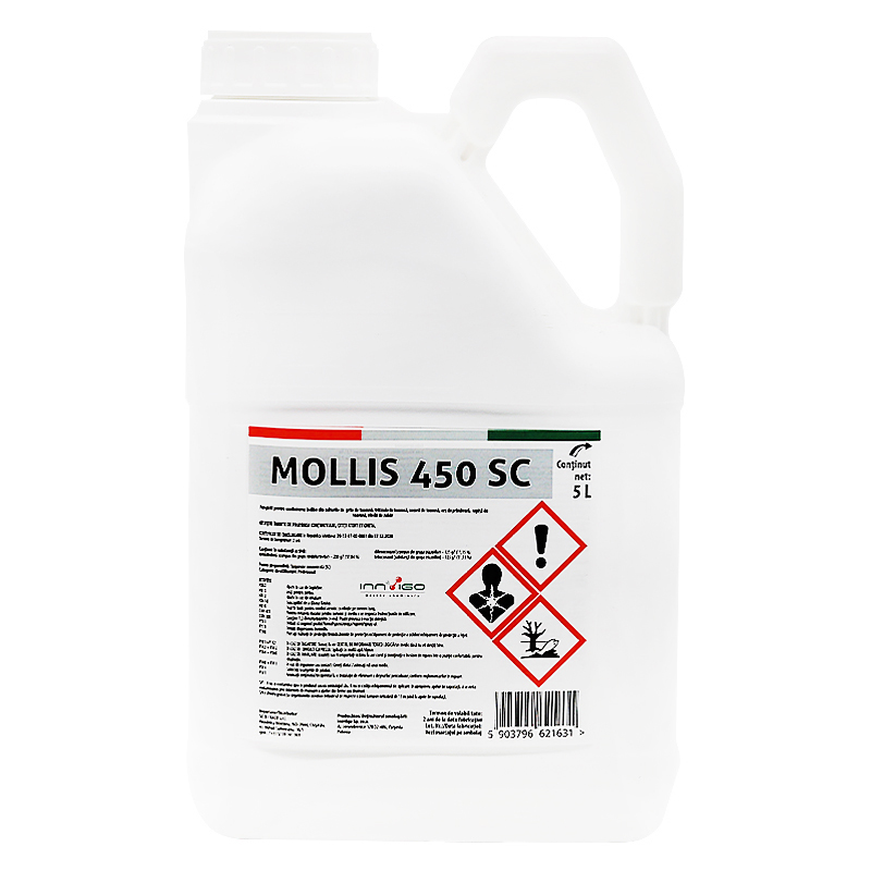 DESCRIEREA MODULUI DE ACŢIUNE: Fungicid, sub formă de suspensie concentrată (SC) de culoare albă şi aspect omogen, pentru utilizare preventivă şi de intervenție împotriva bolilor fungice. Mollis 450 SC este un produs sistemic cu acțiune preventivă si curativă pentru protecţia culturilor impotriva unui spectru larg de boli. Produsul trebuie aplicat înainte sau după observarea primelor simptome de boală. După aplicare, în scurt timp cele trei substanțe sunt absorbite şi distribuite uniform în plantă, către toate vârfurile de creştere, protejând întreaga plantă o perioadă îndelungată.