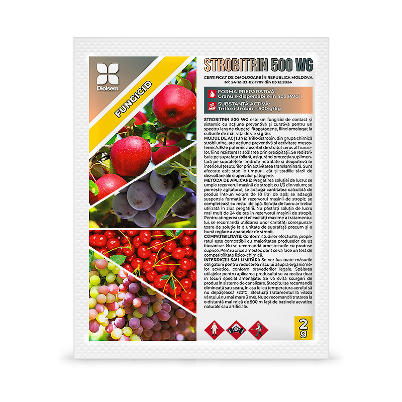 Strobitrin 500 WG este un fungicid sistemic din clasa strobilurinelor, cu acțiune preventivă și activitate mezosistemică. Este puternic absorbit de stratul ceros al frunzelor, fiind rezistent la spălare. Se redistribuie pe întreaga suprafață foliară, asigurând protecție suplimentară pe suprafețele netratate și în interiorul țesuturilor prin activitatea sa translaminară. Produsul afectează atât stadiile timpurii, cât și stadiile târzii de dezvoltare ale ciupercilor patogene. Produsul este omologat la următoarele culture: măr (rapăn, făinare), vița de vie (făinare) și grâu (făinare, pirenoforoza).