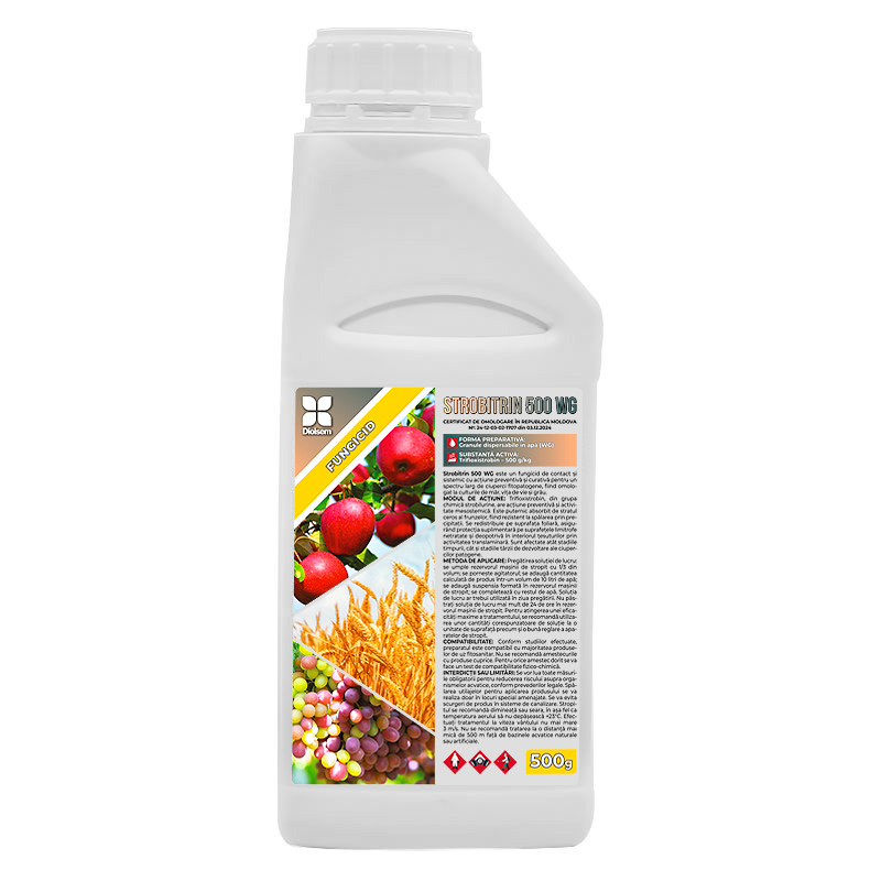 Strobitrin 500 WG este un fungicid sistemic din clasa strobilurinelor, cu acțiune preventivă și activitate mezosistemică. Este puternic absorbit de stratul ceros al frunzelor, fiind rezistent la spălare. Se redistribuie pe întreaga suprafață foliară, asigurând protecție suplimentară pe suprafețele netratate și în interiorul țesuturilor prin activitatea sa translaminară. Produsul afectează atât stadiile timpurii, cât și stadiile târzii de dezvoltare ale ciupercilor patogene. Produsul este omologat la următoarele culture: măr (rapăn, făinare), vița de vie (făinare) și grâu (făinare, pirenoforoza).