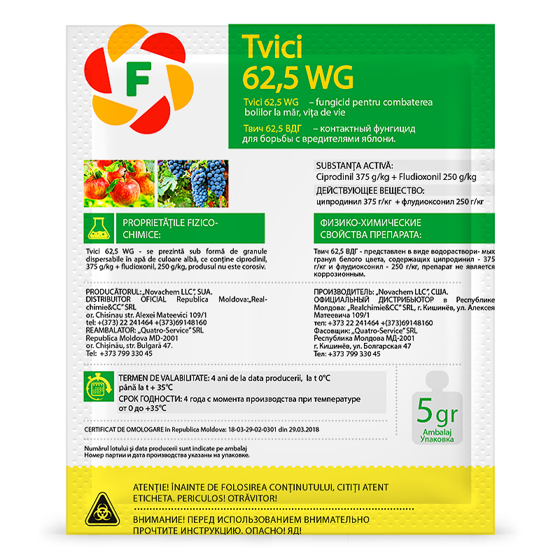 Tvici 62,5 WG este un fungicid utilizat pentru combaterea bolilor la măr și viță de vie. Se prezintă sub formă de granule dispersabile în apă de culoare albă, conținând ciprodinil, 375 g/kg + fludioxonil, 250 g/kg. Produsul nu este corosiv.