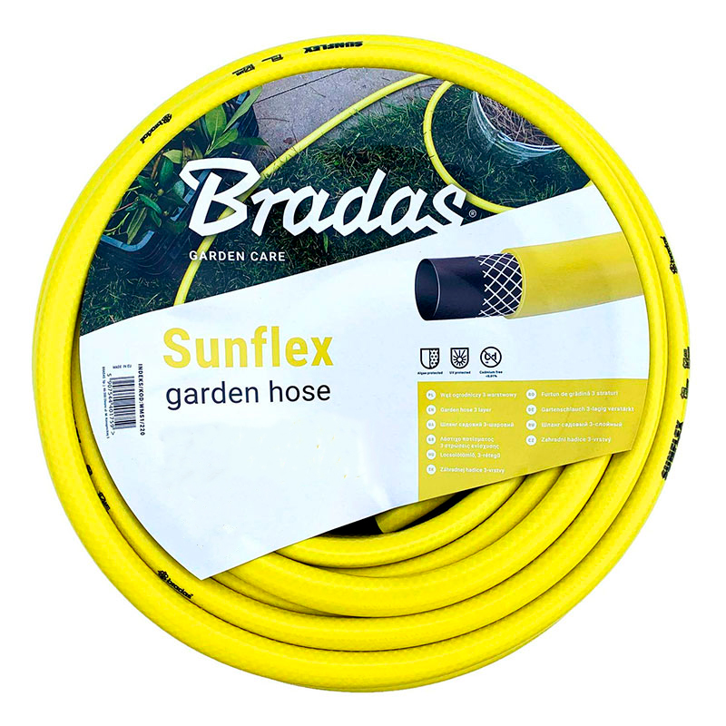 Bradas Sunflex este un furtun de grădină armat în trei straturi pentru udare și irigare.