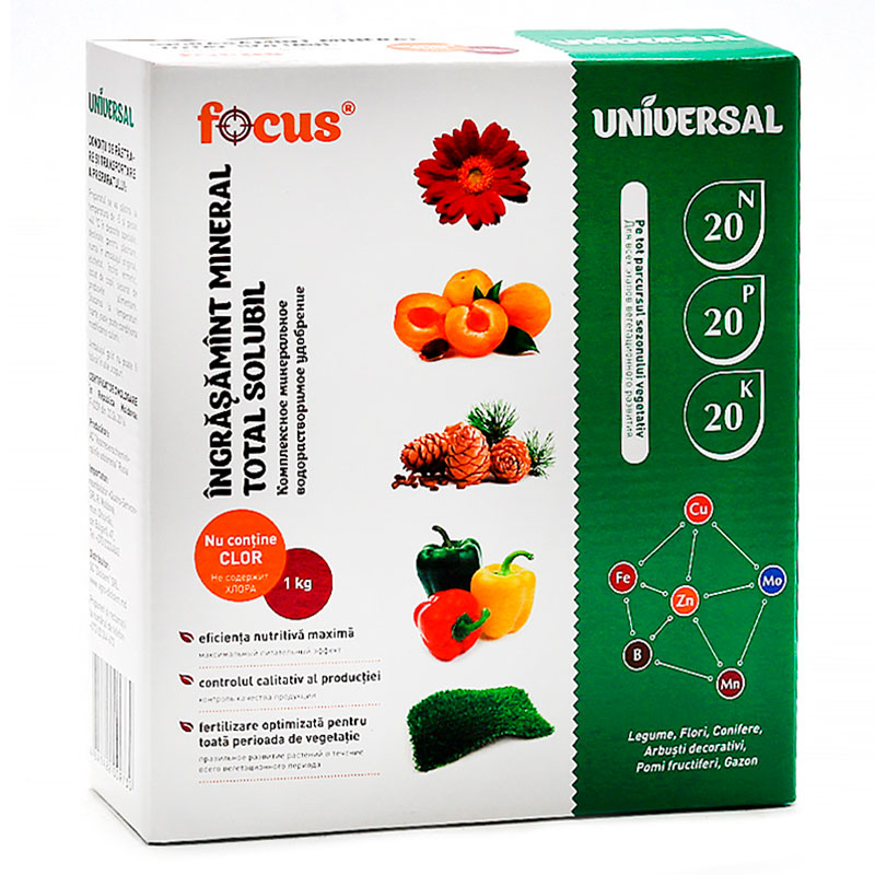 FOCUS UNIVERSAL 20-20-20+ME este prevăzut pentru nutriția alimentară a plantelor în toate fazele de creștere: asigură o bună dezvoltare a plantelor pe tot parcursul sezonului vegetativ; eficient în perioadele în care plantele sunt în condiții de stres (secetă, umiditate sporită, dăunători şi boli, etc.). Produsul este fabricat din materie primă pur ecologică, nu conține natriu, clor şi metale grele, se dizolvă rapid și complet în apă. Un efect major al utilizării mărcii UNIVERSAL 20-20-20 in sistemele de fertirigare în teren deschis este atins la solurile sărace în substanțe nutritive (soluri nisipoase, grele, acide și alcaline). Perfect pentru utilizarea în producţia de seră și în timpul aplicării foliare.
