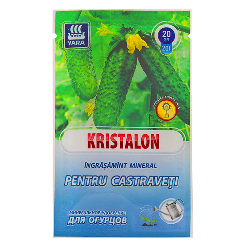 Kristalon pentru castraveți este un îngrășământ complet solubil în apă ce conține azot, fosfor, și potasiu. Are o compoziție bine echilibrată, destinată pentru fertilizarea tutror speciilor de plante din familia Cucurbitaceae, inclusiv și castraveții pe teren deschis și sere. Acesta contribuie la creșterea randamentului și îmbunătățeste calitate fructelor.