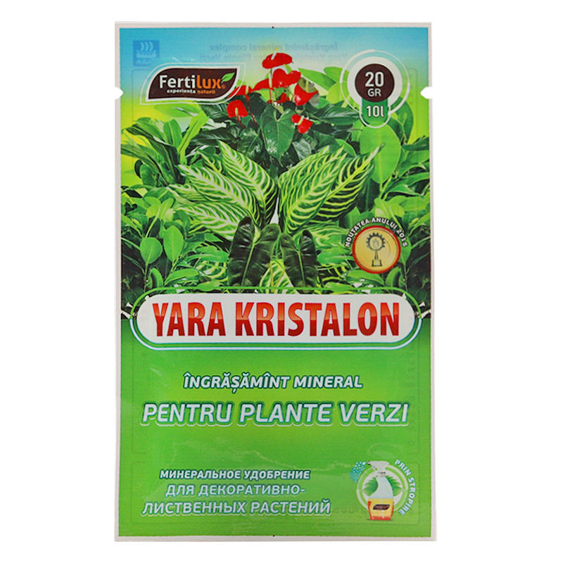 Yara Kristalon pentru plante verzi este un îngrășământ mineral pentru toate tipurile de plante verzi crescute în condiții de cameră, îmbogățit cu un conținut optim de micro și macroelemente, care asigură creșterea și dezvoltarea plantelor. Aplicarea regulată întărește rădăcina și imunitatea plantei împotriva dăunătorilor, îmbunătățește și stimulează procesul de formare a mugurilor, prelungește procesul de înflorire și conferă florilor un aspect bogat. Îngrășământ mineral se dizolvă foarte rapid, iar micro și macroelementele pe care le conține sunt asimilate repede de plantă, oferind un rezultat vizibil în scurt timp.