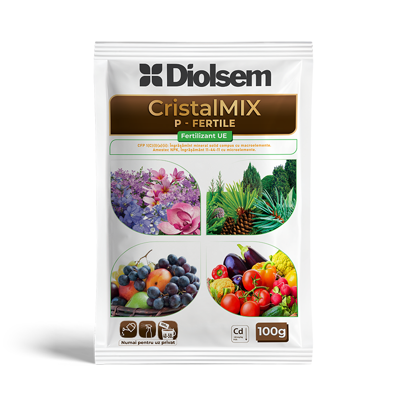 Diolsem CristalMix P–Fertile este recomandat pentru utilizare din primăvară până în toamnă. Pentru aplicarea corectă, se dizolvă 1 kg de fertilizant într-un volum de 100 litri de apă și se aplică la sol prin udare la rădăcină în jurul plantelor, de asemenea, fertilizantul poate fi aplicat și prin stropire foliară, utilizând aceeași soluție. Dozele exacte pot varia în funcție de tipul de sol, stadiul de dezvoltare al plantelor și condițiile climatice. Pentru a preveni arsurile solare, evitați aplicarea îngrășămân - tului pe frunzele plantelor în timpul zilei, când soarele este puternic. Asigurați o udare regulată pentru a susține creșterea optimă și o înflorire abundentă a plantelor. A se utiliza exclusiv în caz de necesitate recunoscută. A nu se depăși doza de aplicare