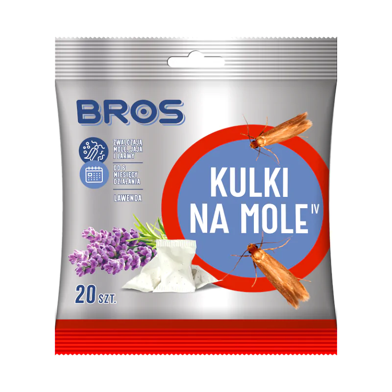 Bilele sunt capabile să combată atât moliile adulte, dar și ouăle și larvele acestora. Acest agent biocid își arată efectul în primele 8 ore de la aplicare și rămâne eficient până la 6 luni. Fiecare naftalină BROS este plasată într-o pungă separată, perforată. Acest lucru face utilizarea acestei soluții mult mai ușoară și mai convenabilă. Utilizatorul nu are contact direct cu substanța activă conținută în bile.