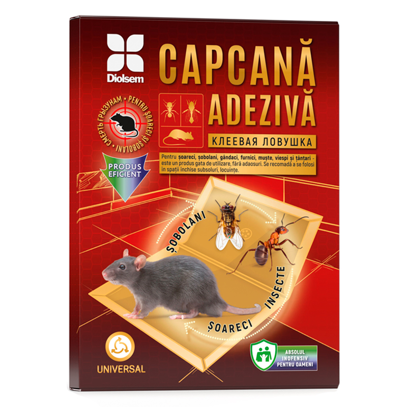 CAPCANĂ ADEZIVĂ împotriva șoareci, şobolani, gândaci, furnici, muşte, viespi și țânțari - este un produs gata de utilizare, fără adaosuri. Se recomadă a se folosi în spații închise subsoluri, locuințe.