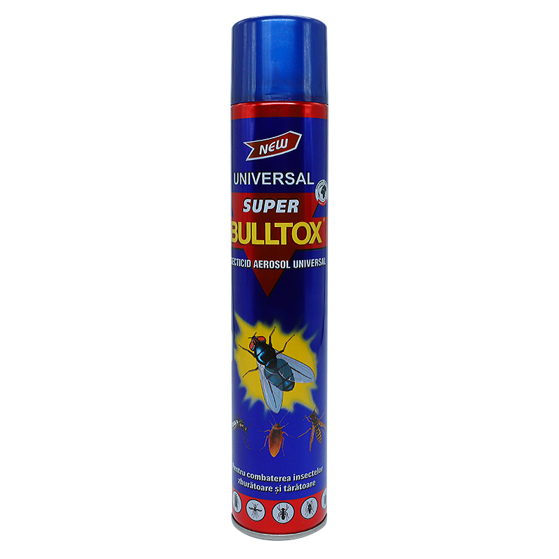 Spray-ul Universal Super Bulltox Blue - este un biocid eficient pentru combaterea insectelor zburătoare, precum muștele și țânțarii, dar și a celor vizuinătoare, cum ar fi gândacii și furnicile, în spațiile rezidențiale, publice și comerciale. Acesta este un aerosol gata de utilizare, care trebuie agitat înainte de aplicare. Înainte de tratament, se recomandă evacuarea oamenilor și animalelor din cameră, iar acvariile și cuștile pentru animale să fie acoperite. Pentru muște și țânțari, pulverizați la o distanță sigură, evitând tapetul și suprafețele sensibile. Tratamentul pentru o cameră de 30 m³ durează 6-7 secunde, iar după aplicare, lăsați camera închisă 10-15 minute și ventilați-o timp de 60 de minute. Pentru gândaci și furnici, aplicați spray-ul pe suprafețele de trafic la o distanță de 30 cm, repetând tratamentul dacă este necesar. Eficiența scade în timp.