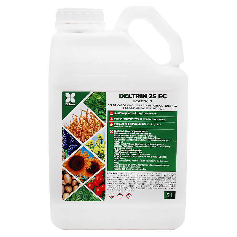 Descriere: Deltrin 25 EC este un insecticid de contact, din clasa piretroizilor sintetici, ce conține substanţa activă deltametrin. Produsul beneficiază de o formulare modernă, caracterizată prin stabilitate ridicată la temperaturi mari şi lipsa fotosensibilității. Are un spectru larg de acţiune, prin contact și ingestie, asupra la aşa clase de dăunatori precum: Coleoptere, Lepidoptere, Homoptere, Diptere, Hemiptere, Ortoptere, Trips și altele, aflate atât în stadiul de larve, cât și de adulți. Poate fi aplicat și la temperaturi mai ridicate, fără diminuarea eficacităţii.