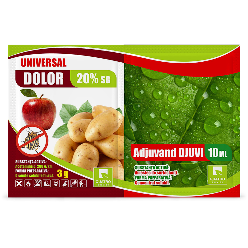 DOLOR 20% SG este un insecticid sistemic cu spectru larg de combatere a daunatorilor la cartof, măr. Preparatul DOLOR 20% SG prezintă o acţiune rapidă cu efect de combatere de lungă durată (2-3 săptămâni).