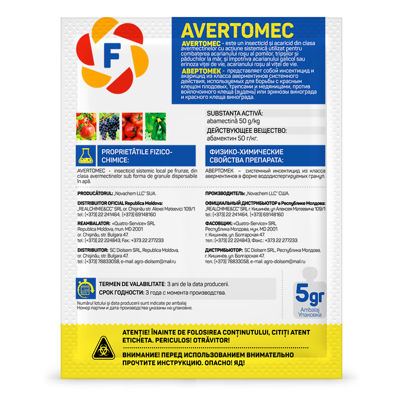 AVERTOMEC - este un insecticid și acaricid din clasa avermectinelor cu acțiune sistemică utilizat pentru combaterea acarianului roşu al pomilor, tripşilor şi păduchilor la măr, şi împotriva acarianului galicol sau erinoza viţei de vie, acarianului roşu al viţei de vie.