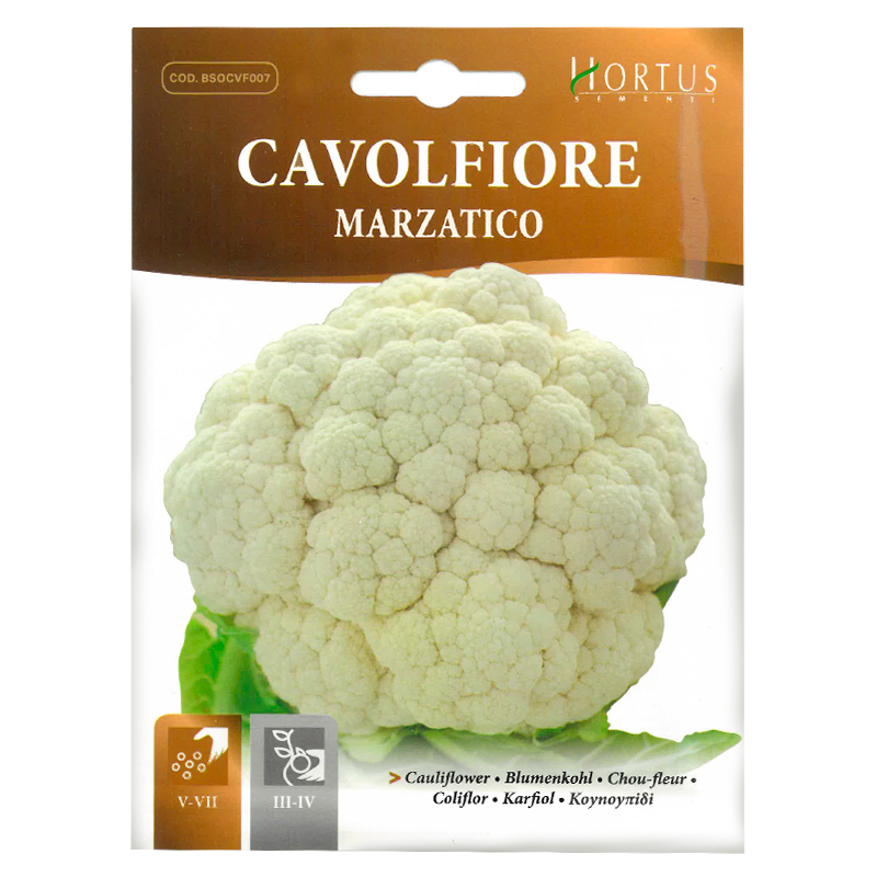 Marzatico produce capete mari, rotunde, de culoare albă pură. Plante viguroase cu frunze puternice care protejează capetele. Frunzele au o nuanță ușor gri. Rezistență excepțională la vreme rece. Varietate târzie. Brassica oleracea botrytis. 50 semințe/pachet.