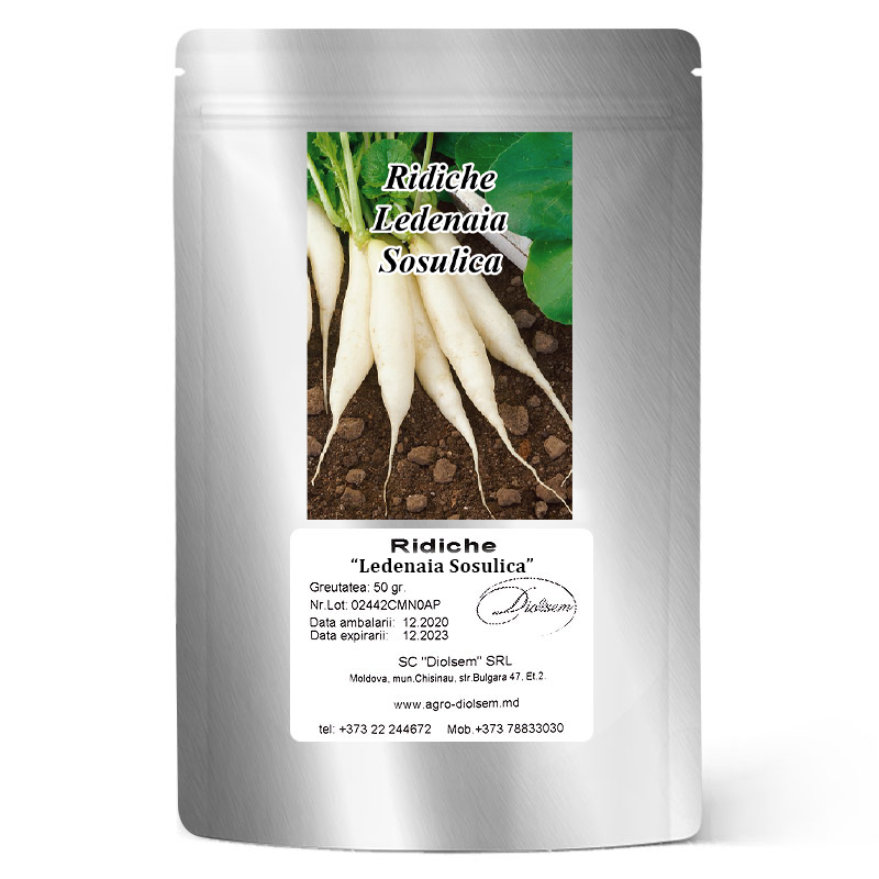 Ridiche de luna "Ledenaia Sosulica" – soi de ridiche cu randament mediu-timpuriu. Sezonul de creștere de la germinare până la recoltare este de 35-40 de zile. Rădăcinile sunt albe, de până la 15 cm lungime, seamănă cu un cub de gheață. Pulpa este albă, medie ascuțită, foarte suculentă. Soiul este rezistent la șuruburi și goluri. Pentru ca culturile de rădăcini să crească mari, iar plantele să nu formeze săgeți de flori, să nu îngroașe culturile, acest soi este cultivat cu succes atât în sere de film, cât și în condiții de teren deschis. Planta este rezistentă la frig, fructele se coc în același timp. Soiul este destinat vânzării proaspete la începutul primăverii și la sfârșitul toamnei. Ridichea este o plantă rezistentă la frig, semințele încep să germineze la 2-4 grade C, iar germenii pot rezista la îngheț până la 2-3°С de îngheț. Temperatura optimă pentru creșterea plantelor este de 12-15°С înainte de formarea culturilor de rădăcini și 16-22°С în timpul creșterii culturilor de rădăcini. De la temperaturi mai ridicate, culturile de rădăcini devin mai groase și capătă un gust înțepător. Ridichea este foarte solicitantă pentru regimul de lumină și nu tolerează umbra. Are nevoie de umiditate ridicată în aer și sol. Adâncimea de însămânțare este de 2 cm.