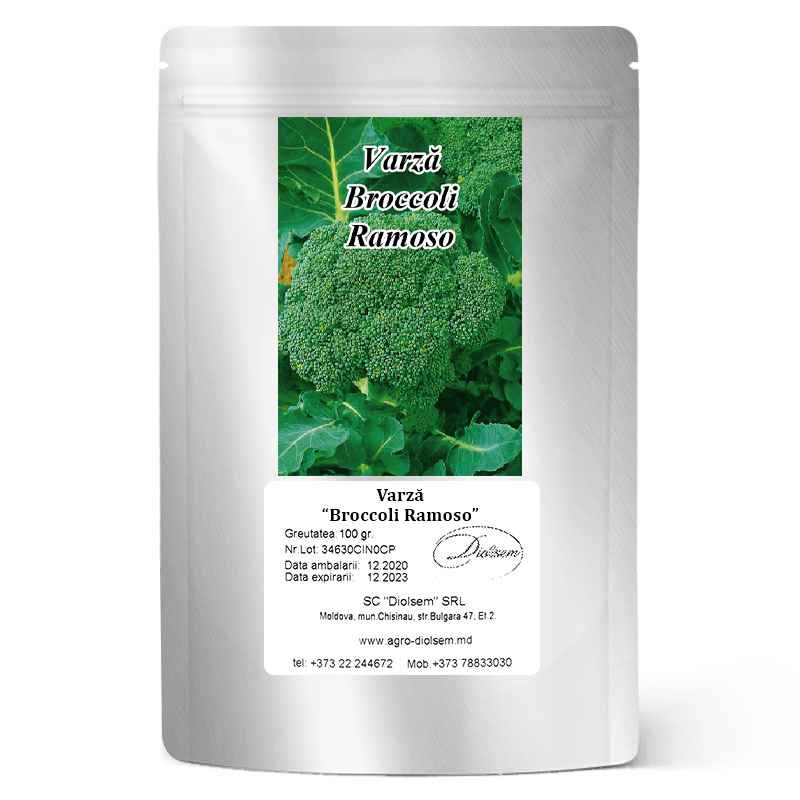 Varză Broccoli "Ramoso" - bogat în vitamine și oligoelemente. Perioada de coacere este de 100-120 de zile. Capetele sunt verzi, cu o nuanță albăstruie, cântărind până la 400 g, gust delicat, picant. Se folosește la gătit acasă, pentru conservare și congelare. Pentru a obține produse timpurii, broccoli este cultivat în răsaduri. Semințele sunt semănate în aprilie. Plantele sunt plantate într-un loc permanent, la vârsta de 35-45 de zile cu 5-6 frunze. Creșterea excesivă a răsadurilor este inacceptabilă, deoarece este dificil să obțineți capete de înaltă calitate din acesta. Transplantul se efectuează la sfârșitul lunii aprilie – începutul lunii mai sub adăposturi temporare. Schema de plantare a răsadurilor 60x30 cm. Pentru a prelungi sezonul de consum de broccoli, puteți semăna semințe pentru răsaduri la intervale de 2 săptămâni de 3-4 ori pe sezon și puteți folosi soiuri de diferite perioade de coacere. Curățarea începe când capetele ating dimensiunea dorită, dar mugurii nu au început încă să înflorească.