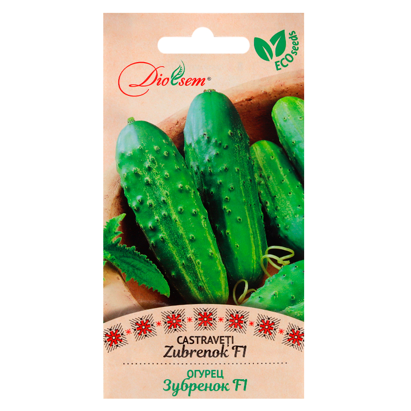 Castraveți "Zubrenok F1'' - hibrid semitimpuriu pentru cultivare în sol neprotejat și în sere de primăvară. Plantă viguroasă, cu o bună capacitate de regenerare. Perioda de vegetație durează 49-52 zile, hibridul asigură o recoltă stabilă pe toată perioda fructificării. Fructele sunt ușor țepoase, cu lungime de 10-12 cm, masa 90-110 g, de culoare verde-închis. Fructele imature sunt crocante, fără amăreală.