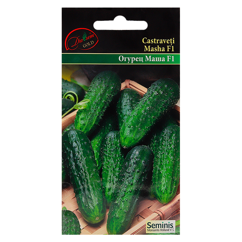 Castraveți "Masha F1" - cel mai timpuriu hibrid partenocarpic existent în prezent. Nu trebuie polenizat de albine. Cu o nutriție suficientă, poate forma 6-7 castraveți pe fiecare nod. Castraveții nu amar, cresc foarte repede. Fructele sunt destinate consumului proaspăt, precum și procesării. Rezistent la crusta și mucegaiul pudră, tolerant la virusul mozaicului castanului. Recomandat pentru cultivare în sere din sticlă și polietilenă, precum și în teren deschis pe căi orizontale și verticale.