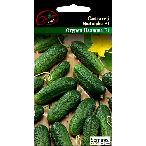 Castraveti "Nadiusha F1" - cel mai nou hibrid foarte timpuriu polenizat de albine, predominat cu un tip de înflorire feminin. Cultura este de creștere medie, foarte sănătoasă pe întreaga periodă de cultivare. Plodurile sunt foarte omogene, de o formă cilindrică, de culoare verde-închisă, la exterior nu se deosebește de hibrizii partenocarpici. Au o consistență bună (compactitate), nu sunt amari, raportul dintre lungime/lățime: 3,1. Se recomandă pentru consumul în formă proaspătă precum și pentru prelucrare.