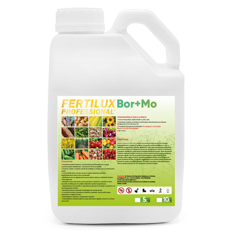 FERTILUX PROFESSIONAL BOR+MO conține cea mai bună formă de bor sub formă de boroetanolamină, mangan şi molibden. Este perfect pentru fertilizarea cu bor şi molibden la majoritatea culturilor. Molibdenul creşte absorbția azotului administrat sub formă de nitrat prin accelerarea procesului de conversie a acestuia în aminoacizi şi proteine, limitând în acelaşi timp acumularea de nitraţi în plante. Borul stimulează creşterea, reglează echilibrul hormonal, procesul de fotosinteză şi creşte viabilitatea polenului vegetal. Este recomandată în special pentru rapiță, sfeclă de zahăr, porumb, cartofi, legume i livezi, datorită sensibilității ridicate a acestor tipuri de plante la deficitul de bor şi molibden. Îngrăşămîntul este eficient pentru hrănirea de toamnă la cereale, permiţând plantelor să atingă o dezvoltare optimă înainte de a intra în repausul de iarnă şi să le sporească rezistenţa la îngheţ.