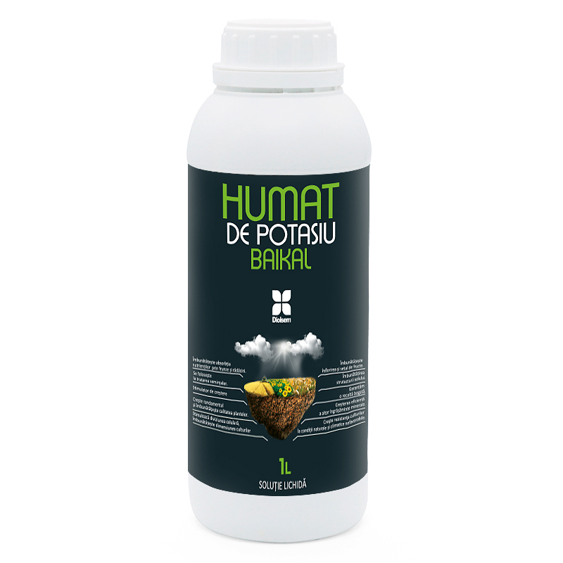 Humat de potasiu Baikal (gumat de caliu) este un fertilizant pentru porumb, grâu şi floarea soarelui, flori de cameră, gazon, ronduri florale şi arbuşti decorative pe baza humaților de potasiu.