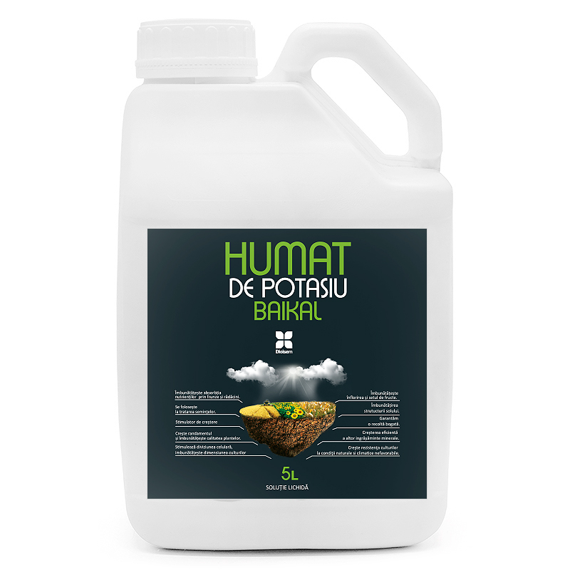 Humat de potasiu Baikal (gumat de caliu) este un fertilizant pentru porumb, grâu şi floarea soarelui, flori de cameră, gazon, ronduri florale şi arbuşti decorative pe baza humaților de potasiu.
