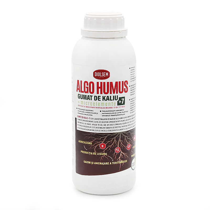 ALGO HUMUS (GUMAT DE CALIU +7) este un biostimulator pe bază de acizi humici și alge marine Ascophilum Nodosum (100% naturali), îmbogățit cu macro și microelemente, cu rol de creștere a productivității plantelor, reface și ameliorează fertilitatea solului prin sporirea conținutului de humus. Aplicat în sol are un efect stimulativ asupra creșterii plantelor și mai ales asupra dezvoltării mai puternice a rădăcinilor, este un stimulent bioactiv de creștere, în special pentru solurile nisipoase și argiloase grele. Stimuleaza activitatea microorganismelor utile din sol și deblocheaza elementele sale nutritive, îmbunătățind absorbția nutrienților.