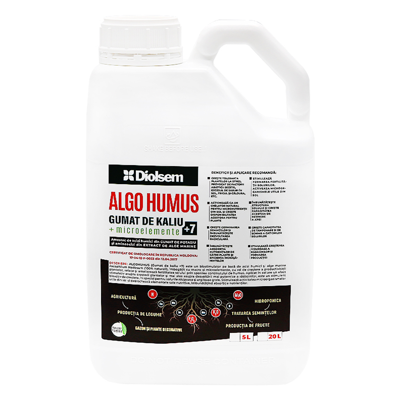 ALGO HUMUS (GUMAT DE CALIU +7) este un biostimulator pe bază de acizi humici și alge marine Ascophilum Nodosum (100% naturali), îmbogățit cu macro și microelemente, cu rol de creștere a productivității plantelor, reface și ameliorează fertilitatea solului prin sporirea conținutului de humus. Aplicat în sol are un efect stimulativ asupra creșterii plantelor și mai ales asupra dezvoltării mai puternice a rădăcinilor, este un stimulent bioactiv de creștere, în special pentru solurile nisipoase și argiloase grele. Stimuleaza activitatea microorganismelor utile din sol și deblocheaza elementele sale nutritive, îmbunătățind absorbția nutrienților.