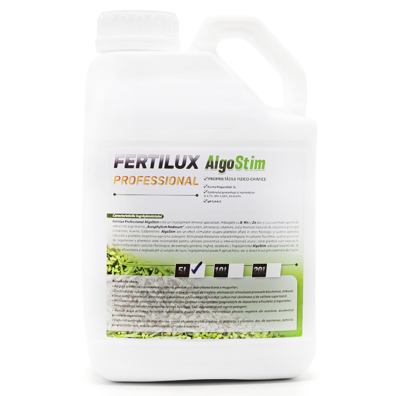 FERTILUX PROFESSIONAL ALGOSTIM este un îngrăşământ mineral specializat, îmbogățit cu B, Mn şi Zn dar şi cu o cantitate sporită de extract de alge marine "Ascophyllum Nodosum", care conțin, aminoacizi, vitamine, iod şi hormoni naturali de creştere în principal Citokinine, Auxine, Gibberelline. AlgoStim are un efect stimulator asupra plantelor aflate în stres fiziologic şi susţine apărarea naturală a plantelor împotriva agenților patogeni. Stimulează diviziunea celulară timpurie în culturile fructifere, susţine procesul de regenerare a plantelor, este recomandat pentru utilizare preventivă şi intervențională atunci când plantele sunt expuse la factori nefavorabili (solicitări fiziologice, de exemplu grindină, îngheţ, secetă etc.). Îngrăşămîntul AlgoStim adăugat la pesticide, le creşte eficacitatea şi reglează pH-ul soluţiei de lucru. Îngrăşământul poate fi aplicat foliar, dar şi direct în sol prin sistemele de irigare.