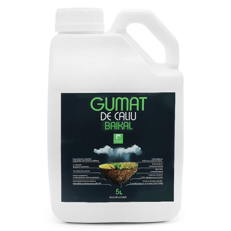 GUMAT DE CALIU BAIKAL 20% este un fertilizant pentru porumb, grâu şi floarea soarelui, flori de cameră, gazon, ronduri florale şi arbuşti decorative pe baza humaților de potasiu.