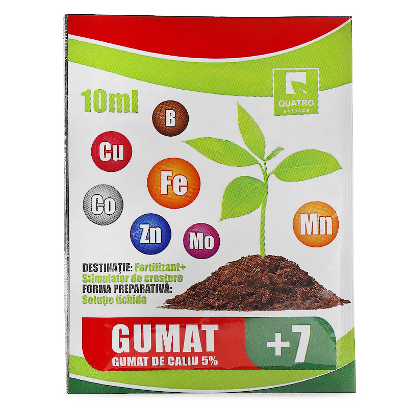 Gumat de Caliu (Potasiu) este un stimulator natural al creșterii și dezvoltării plantelor, conținând o gamă complexă de microelemente necesare pentru nutriția lor. Gumat de Kaliu este un preparat organo-mineral obținut prin prelucrarea materiei prime naturale bogate în humus - lignit. La rândul lui, acesta extrage acizii humici și le activează. Gumat de Kaliu contribuie la intensitatea și durata înfloririi, la creșterea numărului de boboci de flori, reduce stresul în timpul replantării, întărește sistemul radicular, mărește vitalitatea culorilor în condiții nefavorabile.