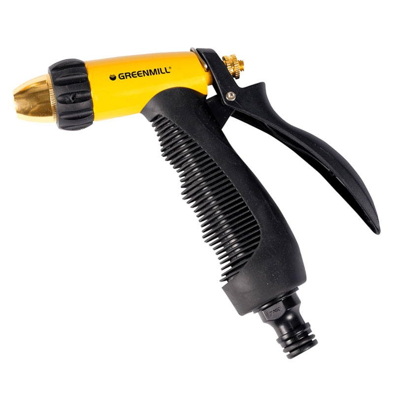 Reglabil la infinit, de la jet puternic la atomizare. Reglarea presiunii apei. Vârf cu tampon antiderapant, mâner elastic. Dispozitiv de blocare pentru a asigura o udare continuă. Carcasă metalică robustă și ușoară.