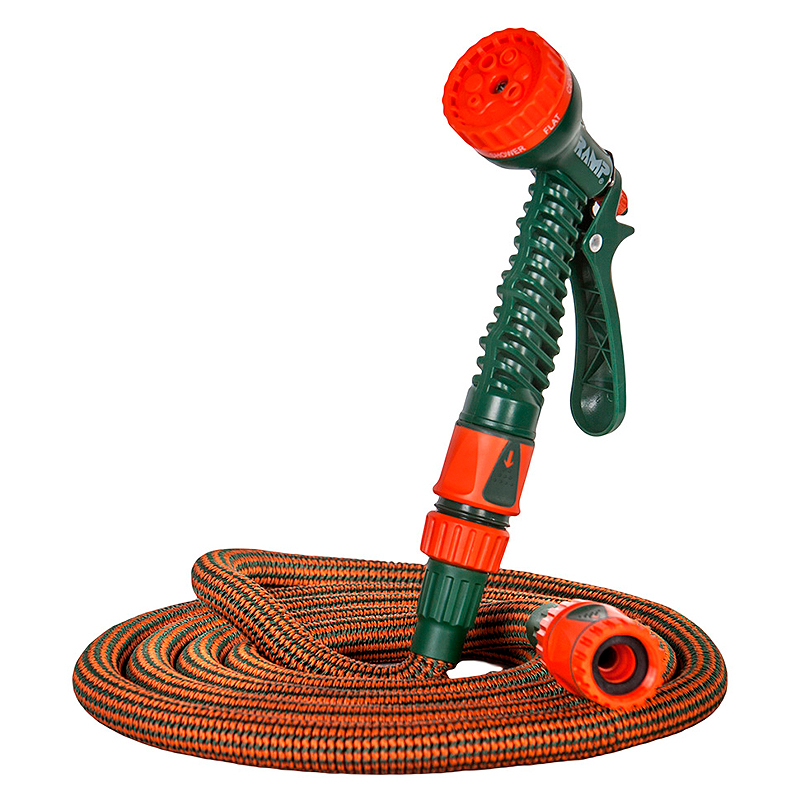 Secretul furtunului RAMP constă în materialul elastic special. Furtunul este realizat din doua straturi de latex de inalta calitate, adaptat pentru a lucra in cele mai grele conditii. Stratul exterior este realizat dintr-o fibra sintetica foarte rezistenta, tesuta in asa fel incat sa ofere protectie maxima furtunului si cea mai mare flexibilitate posibila. Din acest motiv, la câteva secunde după umplere, furtunul se întinde și își mărește lungimea de multe ori. După oprirea alimentării cu apă, acesta revine automat la lungimea inițială. Marele său avantaj este că nu se îndoaie și nu se răsucește. Furtunul este echipat cu două racorduri rapide interschimbabile și o racordare la robinet. Pistolul multifuncțional inclus are 7 moduri de pulverizare și o funcție de blocare - doar înclinați cârligul metalic din pistol pentru a lăsa apa să curgă fără a fi nevoie să apăsați constant pe trăgaciul pistolului. Acesta este un set ideal pentru grădină, teren și terasă. Furtunul RAMP este foarte ușor și ocupă puțin spațiu, așa că poate fi depozitat cu ușurință într-un sertar, pe un raft, pe o barcă, într-o mașină, sau pur și simplu agățat în garaj.