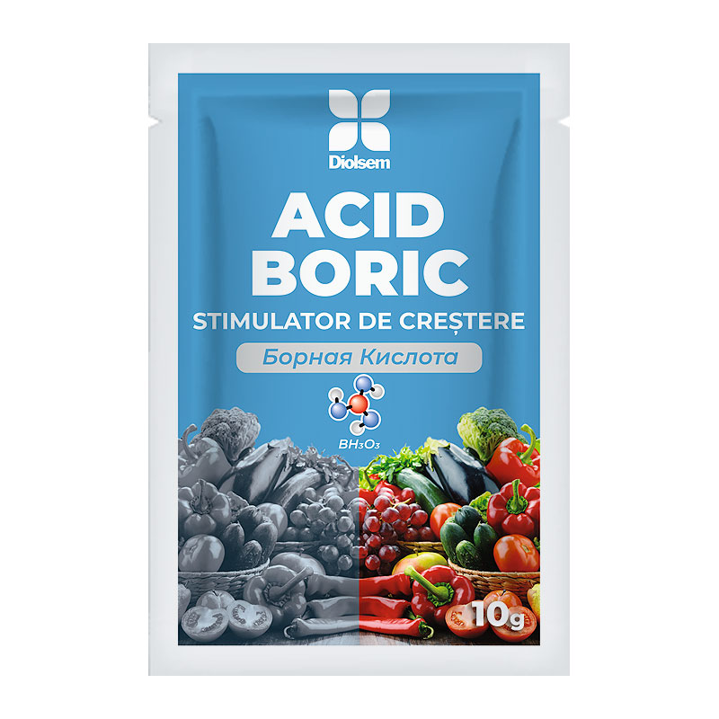 ACIDUL BORIC este utilizat ca preparat antiseptic de uz extern, pentru spălarea rănilor. Borul contribuie la creşterea clorofilei, îmbunătăţeşte recolta, rezistenţa la boli şi la efectele negative ale mediului. Borul este necesar pentru a creşte nivelul de calciu in plante, precum şi pentru dezvoltarea şi restaurarea sistemului radicular, zahăr şi caroten în plute, îmbunătăţeşte intensitatea înfloririi culturilor de flori.Acidul boric ca insecticid de grădină este folosit mai des ca preparat de contact împotriva gândacilor şi furnicilor, dar are şi un efect intestinal. Momeala uscata cu acid bone acţionează ca otrăvuri intestinale de contact contra dăunătorilor. Acţiunea combinată se manifesta treptat, pe măsură ce se acumulează în organismul insectelor