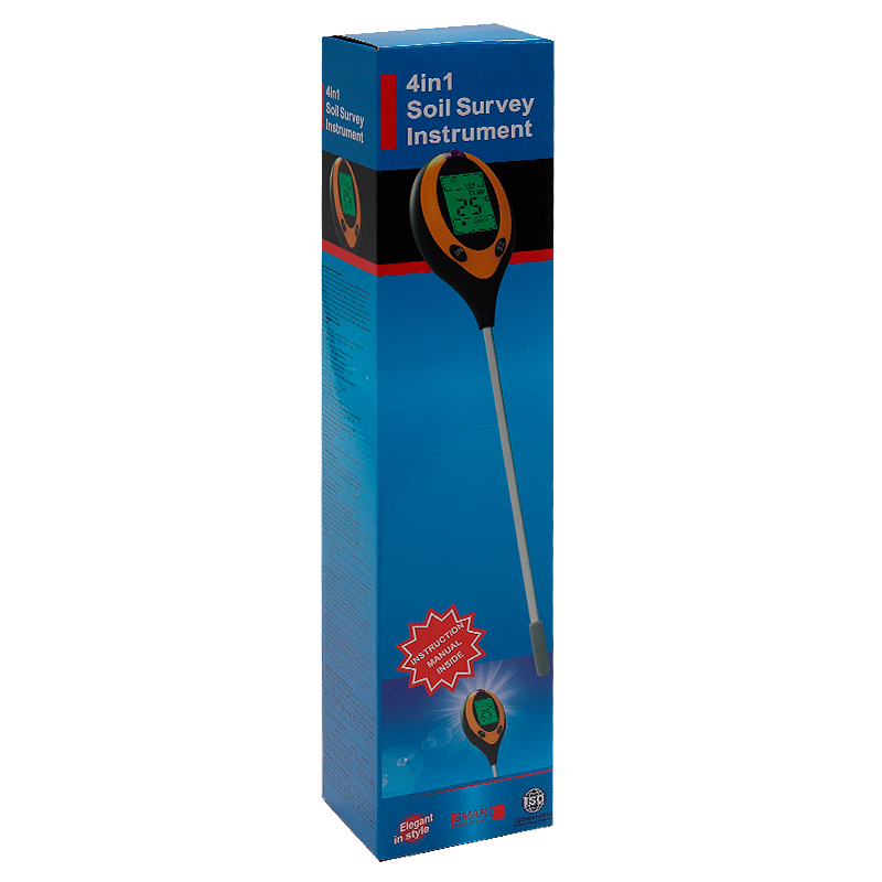 Aparatul electronic de măsurare a solului 4 în 1 este cel mai nou dispozitiv pentru măsurarea rapidă a solului, măsurând în principal pH-ul solului, umiditatea, temperatura și intensitatea luminii plantelor, utilizând o baterie de 9V cu carbon, o funcționare simplă și o lungime a sondei de 200 mm. Acest instrument afișează parametrii de măsurare pe un afișaj cu cristale lichide. Instrumentul are, de asemenea, un indicator de baterie descărcată și o funcție de oprire automată. Acesta economisește timp și efort și este foarte eficient. Instrumentul este potrivit pentru plantarea florilor și ierburilor și pentru amenajări peisagistice.