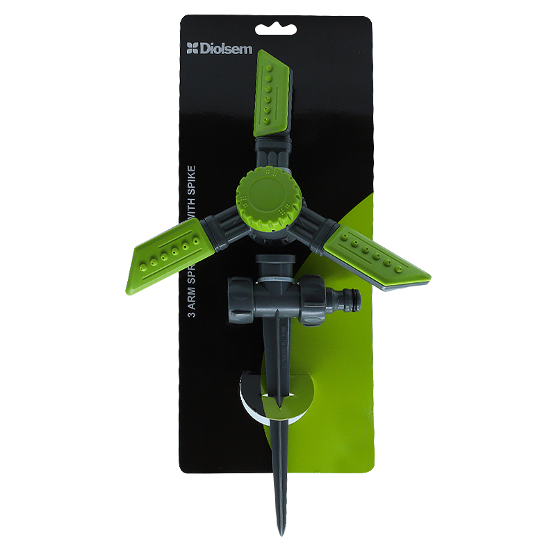 Aspersorul - este un dispozitiv eficient pentru irigarea grădinilor și peluzelor, care oferă o acoperire largă și uniformă a suprafeței de irigat. Acesta este echipat cu 3 elice care ajută la rotirea aspersorului, distribuind apa prin cele 18 orificii într-un mod echilibrat pe o arie mare. Designul cu elice permite aspersorului să se rotească, asigurând o acoperire uniformă și un poliv eficient al plantelor.