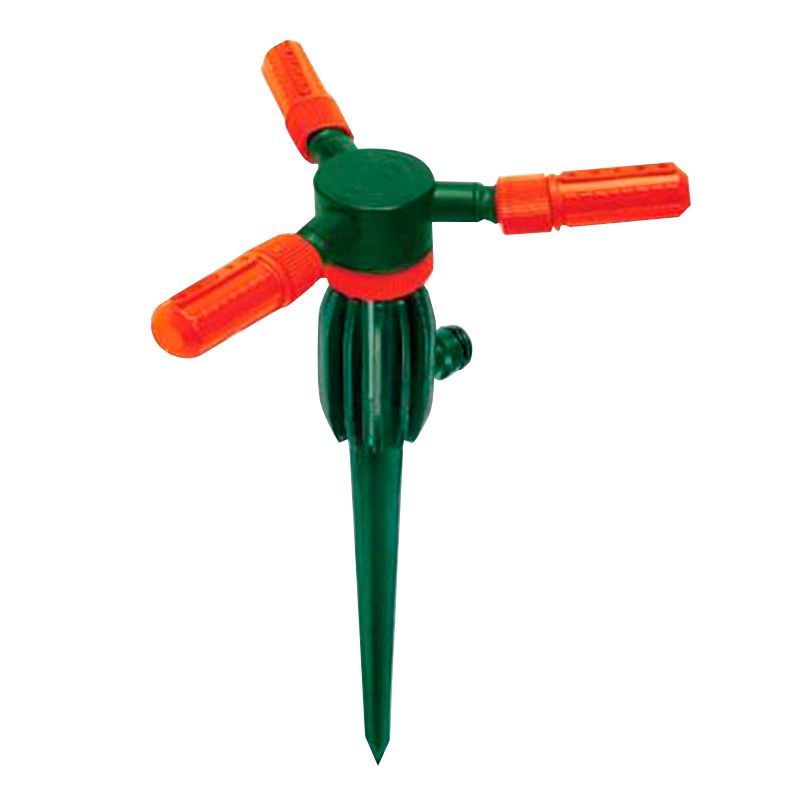 Aspersor pe țerușă, 3 duze pivotante, cuplare rapidă. Fabricat din plastic de înaltă calitate, rezistent la impact. Conceput pentru udarea staționară a plantelor din straturi de flori și diverse suprafețe mici. Cele trei duze rotative asigură o udare uniformă și circulară a grădinii. Se atașează la furtun prin intermediul unui conector. Datorită unui pinten special, aspersorul este fixat în siguranță pe suprafață. Dispozitivul economisește timpul și efortul depus pentru udarea plantelor. Ușor de conectat la furtun cu ajutorul conectorului.